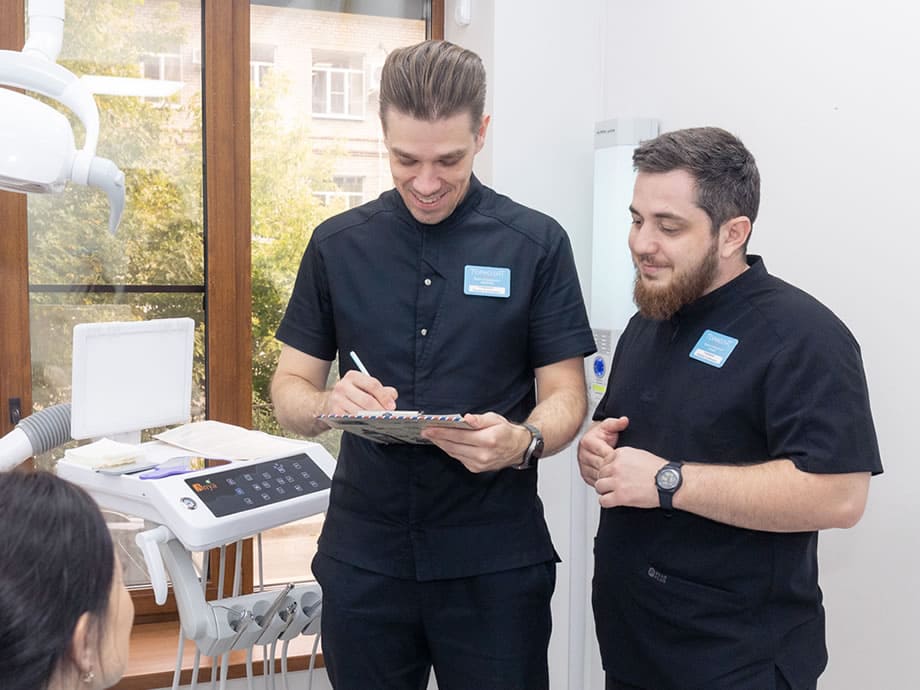 1. Первый этап — совместная консультация стоматолога-хирурга и стоматолога-ортопеда. Наличие КТ и сканирование зубов и мягких тканей позволяют поставить диагноз, составить предварительный план дентальной имплантации и визуализировать будущие искусственные коронки или зубные протезы. Вы получите четкое представление о процессе и поэтапной стоимости всего лечения.
